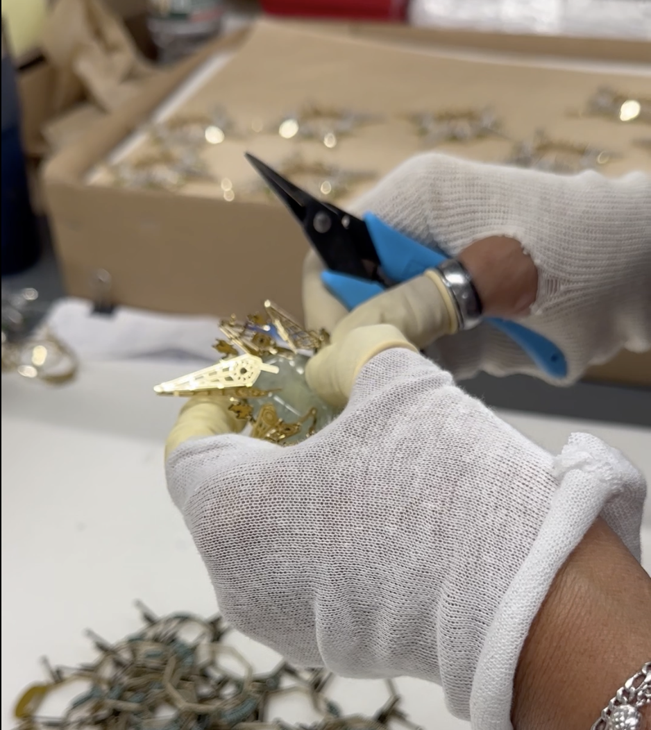 Once cooled and perfected, the custom glass pieces were transferred to Beacon Design. There, designers worked to create the ornate, three-dimensional brass ornament—a concept based on the Capitol’s design vision that mirrored the floor’s iron framework. The design was printed onto brass sheets, meticulously cut out, and shaped using a high-pressure press. The final step was precision handwork: the reclaimed piece of Capitol glass was carefully enclosed within the brass framework by hand, completing the 2025 limited-edition ornament.