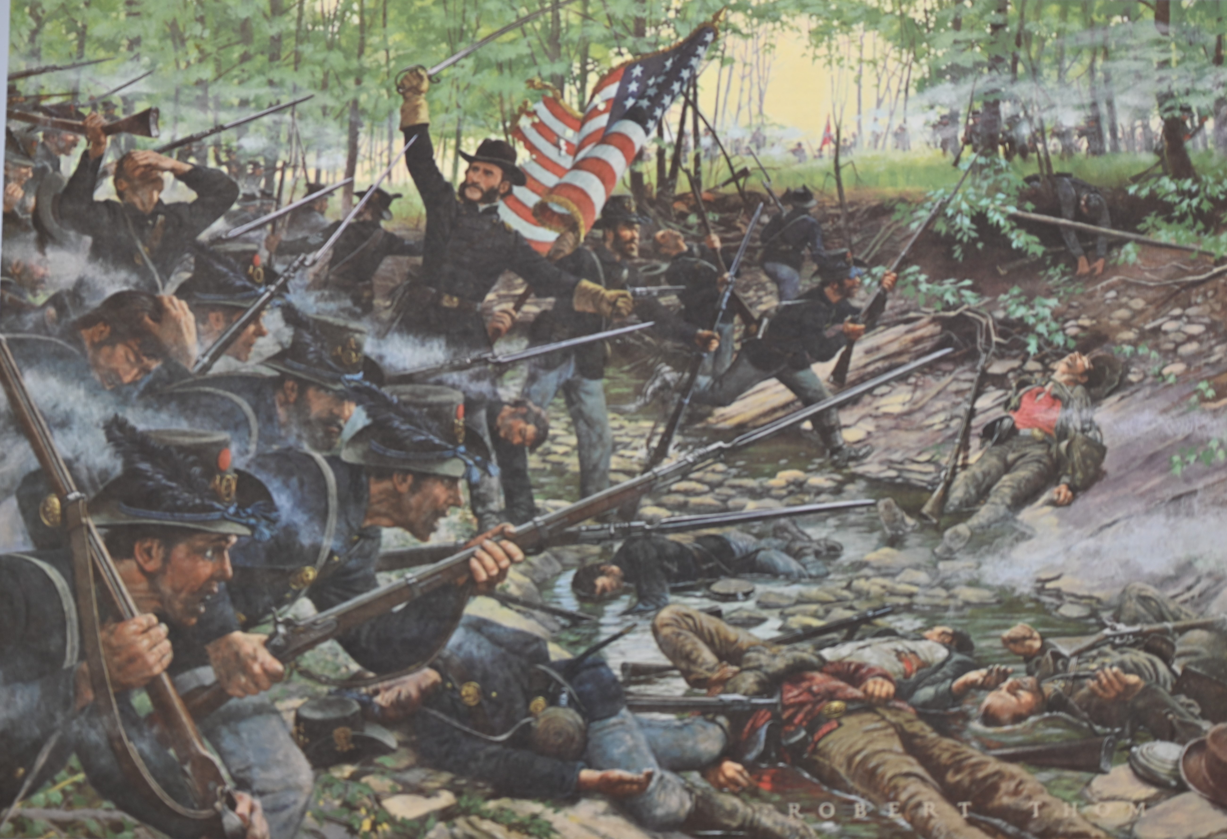 Thom’s artistic style was realistic and straightforward, dominated by clear and detailed linework. Some art historians have compared his work to that of Norman Rockwell, particularly in regard to their narrative-driven nature. Thom considered himself an illustrator during a time when the merits of illustration were often debated amongst fine artists. He stated, “I make no pretense about my work. The technique is clearly illustration. It intends to tell a story and I believe it does. I regard it as visual distillation of whatever I know to be correct about a particular historical event.”[v]